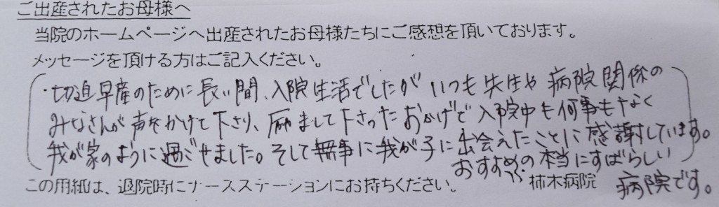 切迫早産のために長い間、入院生活でしたがいつも先生や病院関係のみなさんが声をかけて下さり、励まして下さったおかげで、入院中も何事もなく我が家のように過ごせました。そして無事に我が子に出会えたことに感謝しています。おすすめの本当に素晴らしい病院です。