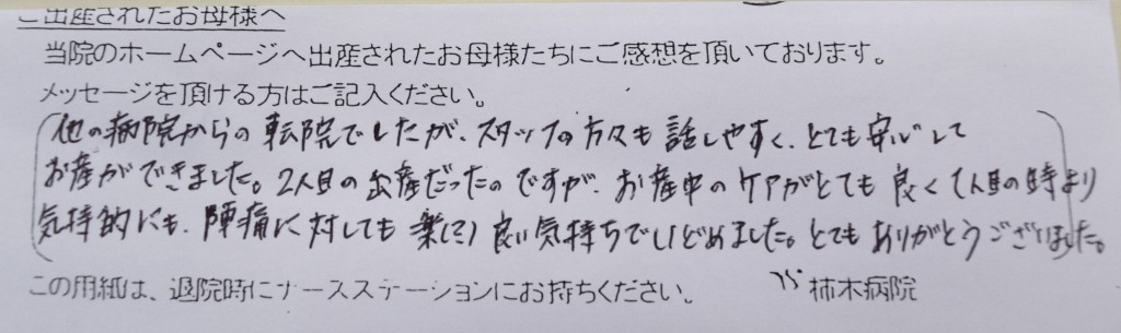 他の病院からの転院でしたが、スタッフの方々も話しやすく、とても安心してお産ができました。2人目の出産だったのですが、お産中のケアがとても良く、1人目の時より気持ち的にも、陣痛に対しても楽(?)良い気持ちでいどめました。ありがとうございました。