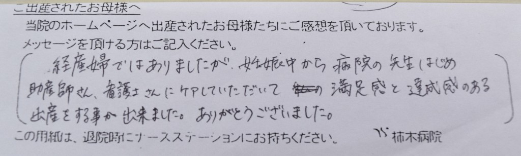 経産婦ではありましたが、妊娠中から病院の先生はじめ助産師さん、看護師さんにケアしていただいて、満足感と達成感のある出産をする事が出来ました。ありがとうございました。