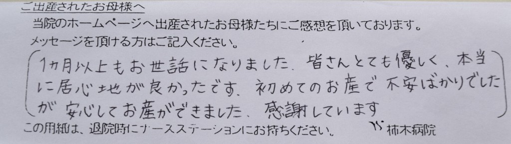 1か月以上もお世話になりました。皆さんとても優しく、本当に居心地が良かったです。初めてのお産で不安ばかりでしたが、安心してお産ができました。感謝しています。