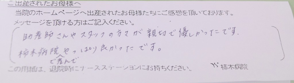 助産師さんやスタッフの方々が親切で優しかったです。柿木病院で産んでやっぱりよかったです。