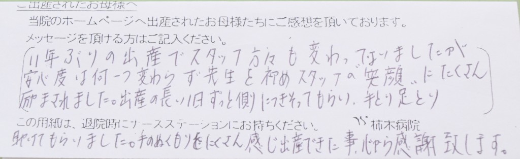 11年ぶりの出産でスタッフの方々も変わってはいましたが安心度は何一つ変わらず先生をはじめスタッフの”笑顔”にたくさん励まされました。出産の時は長い1日ずっと側につきそってもらい、手とり足とり助けてもらいました。手のぬくもりをたくさん感じ出産できた事、心から感謝致します。