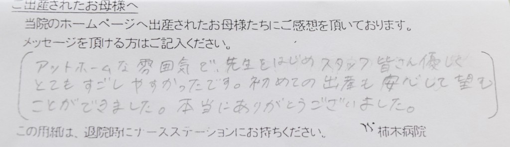アットホームな雰囲気で、先生をはじめスタッフの皆さん優しくとてもすごしやすかったです。はじめての出産も安心して臨むことができました。本当にありがとうございました。
