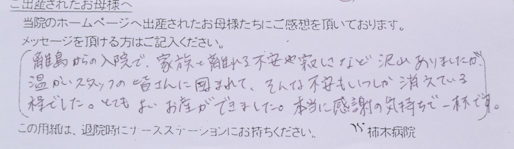 離島からの入院で、家族と離れる不安や寂しさなど沢山ありましたが、温かいスタッフの皆さんに囲まれて、そんな不安もいつしか消えている程でした。とてもよいお産ができました。本当に感謝の気持ちで一杯です。