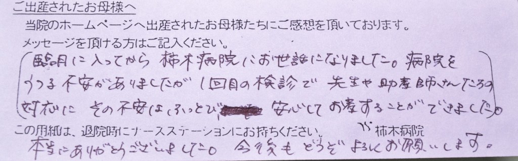 臨月に入ってから柿木病院にお世話になりました。病院をうつる不安がありましたが1回目の検診で先生や助産師さんたちの対応にその不安はふっとび、安心してお産することができました。本当にありがとうございました。今後もどうぞよろしくお願いします。