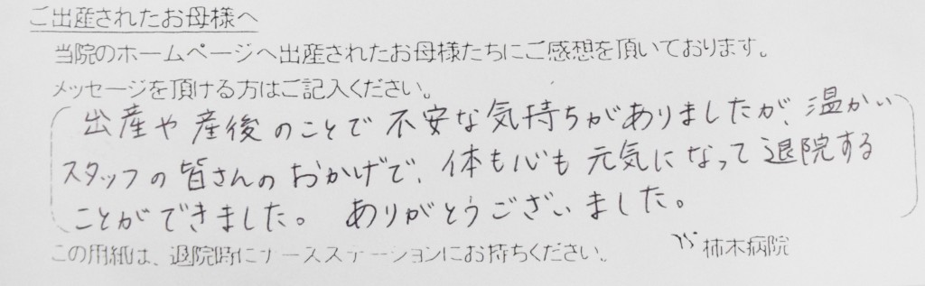 出産や産後のことで不安な気持ちがありましたが、温かいスタッフの皆さんのおかげで、体も心も元気になって退院することができました。ありがとうございました。