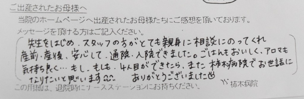 先生をはじめ、スタッフの方がとても親身に相談にのってくれ産前・産後、安心して通院、入院できました。ごはんもおいしく、アロマも気持ちよく・・・もし、もしも、4人目ができたらまた柿木病院でお世話になりたいと思います(^_^)ありがとうございました。