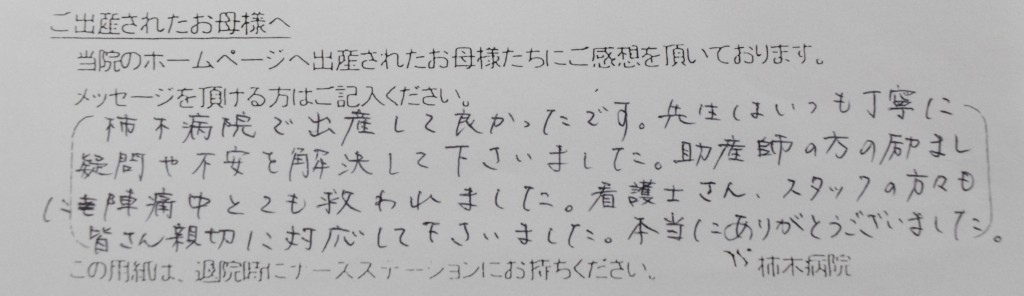 柿木病院で出産して良かったです。先生はいつも丁寧に疑問や不安を解決して下さいました。助産師の方の励ましに陣痛中とても救われました。看護士さん、スタッフの方々も皆さん親切に対応して下さいました。本当にありがとうございました。