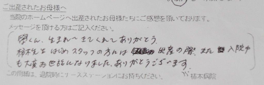 柿木先生はじめスタッフの方々には出産の際、また入院中も大変お世話になりました。ありがとうございます。