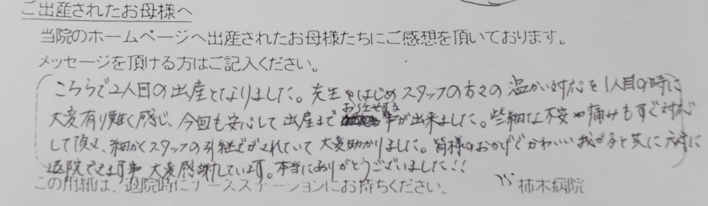 こちらで2人目の出産となりました。先生をはじめスタッフの方々の温かい対応を1人目の時に大変有り難く感じ、今回も安心して出産までお任せする事が出来ました。些細な不安や痛みもすぐ対応して頂き、細かくスタッフの引継ぎがされていて大変助かりました。皆様のおかげでかわいい我が子と共に元気に退院できます事、大変感謝しています。本当にありがとうございました!!