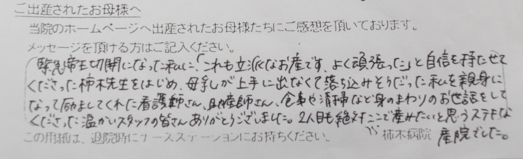 緊急帝王切開になった私に「これも立派なお産です。よく頑張った」と自信を持たせてくださった柿木先生をはじめ、母乳が上手に出なくて落ち込みそうだった私を親身になって励ましてくれた看護師さん、助産師さん、食事や清掃など身のまわりのお世話をしてくださった温かいスタッフの皆さんありがとうございました。2人目も絶対ここで産みたいと思うステキな産院でした。