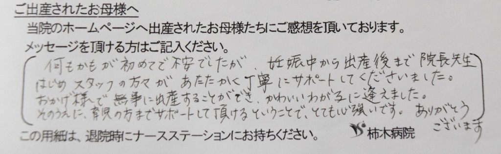 何もかもが初めてで不安でしたが、妊娠中から出産後まで院長先生はじめスタッフの方々があたたかく丁寧にサポートしてくださいました。おかげ様で無事に出産することができ、かわいいわが子に逢えました。そのうえに、育児の方までサポートして頂けるということで、とても心強いです。ありがとうございます。