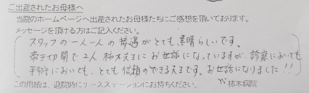 帝王切開で2人柿木先生にお世話になっていますが、診察においても手術においても、とても信頼のできる先生です。お世話になりました!!