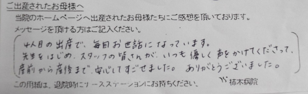 先生をはじめスタッフの皆さんが、いつも優しく声をかけてくださって、産前から産後まで、安心してすごせました。ありがとうございました。