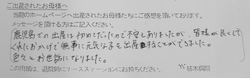 鹿児島での出産は初めてだったので不安もありましたが、皆様が良くしてくれたおかげで無事に元気な子を出産することができました。色々とお世話になりました。