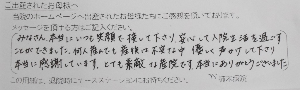 みなさん、本当にいつも笑顔で接して下さり、安心して入院生活を過ごすことができました。何人産んでも産後は不安な中優しく声かけして下さり本当に感謝しています。とても素敵な産院です。本当にありがとうございました。