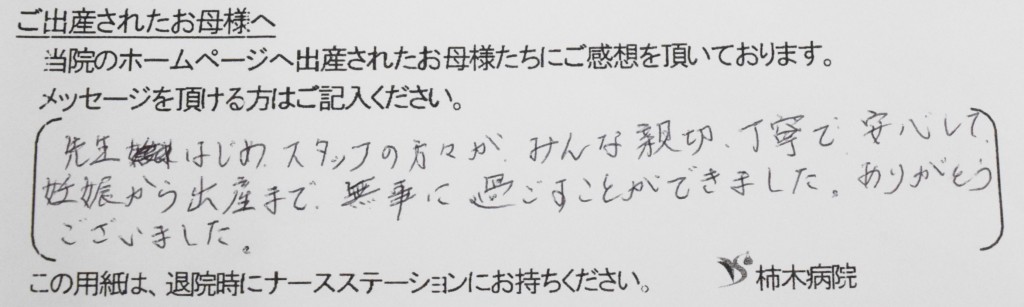 先生をはじめスタッフの方々が、みんな親切、丁寧で安心して妊娠から出産まで無事に過ごすことができました。ありがとうございました。