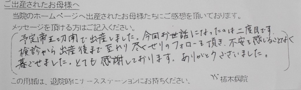 予定帝王切開で出産しました。今回お世話になったのは二度目です。検診から出産後まで至れり尽くせりのフォローを頂き、不安を感じることなく過ごせました。とても感謝しております。ありがとうございました。