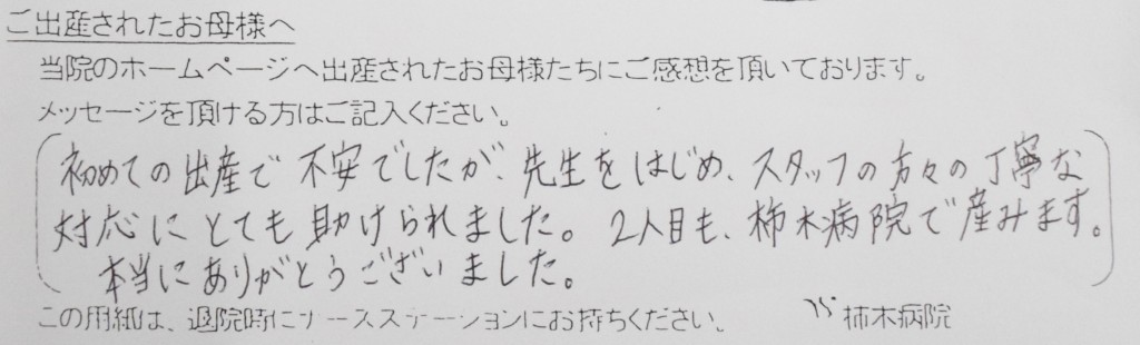 初めての出産で不安でしたが、先生をはじめスタッフの方々の丁寧な対応にとても助けられました。2人目も柿木病院で産みます。本当にありがとうございました。