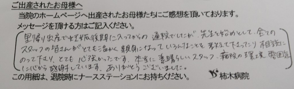 里帰り出産で妊娠後期に入ってからの通院でしたが、先生を始めとして、全てのスタッフの皆さんがとても温かく親身になっていろんなことを教えて下さったり相談にのって下さり、とても心強かったです。本当に素晴らしいスタッフ、病院の環境、雰囲気に心から感謝しています。ありがとうございました。