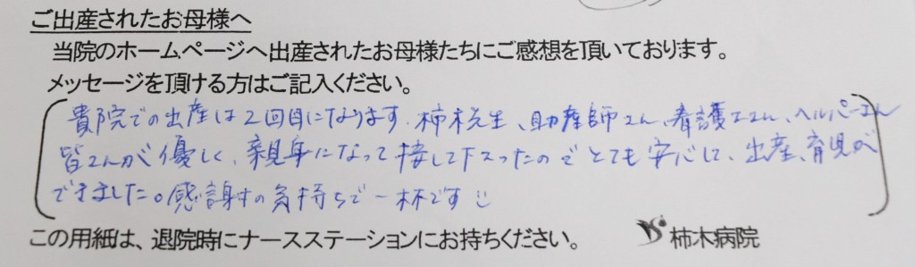 貴院での出産は2回目になります。柿木先生、助産師さん、看護士さん、ヘルパーさん皆さんが優しく、親身になって接して下さったのでとても安心して出産、育児ができました。感謝の気持ちで一杯です☺