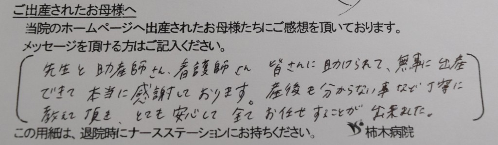 先生と助産師さん、看護士さん皆さんに助けられて、無事に出産できて本当に感謝しております。産後も分からない事など丁寧に教えて頂き、とても安心して全てお任せすることが出来ました。