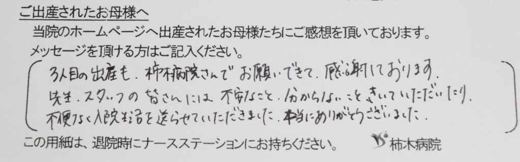 3人目の出産も、柿木病院さんでお願いできて感謝しております。<br />