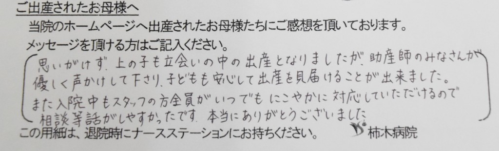 思いがけず、上の子も立会いの中の出産となりましたが、助産師のみなさんが優しく声かけしてくださり、子どもも安心して出産を見届けることが出来ました。また入院中もスタッフの方全員がいつでもにこやかに対応していただけるので相談等話がしやすかったです。本当にありがとうございました。