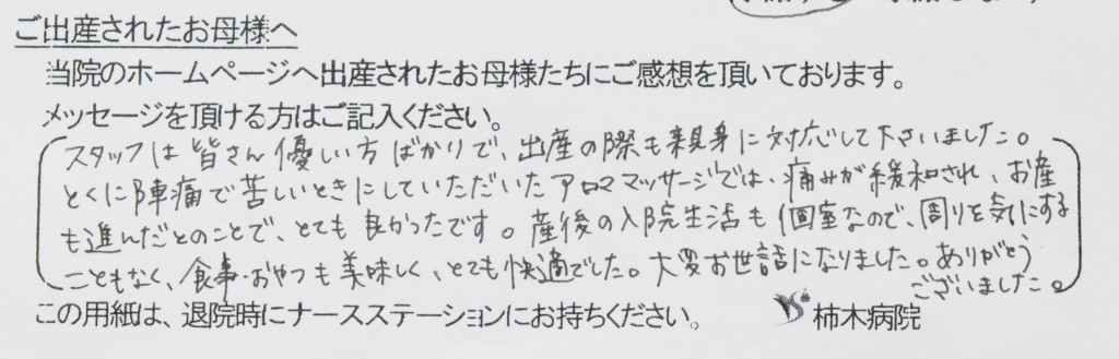スタッフは皆さん優しい方ばかりで、出産の際も親身に対応してくださいました。とくに陣痛で苦しいときにしていただいたアロママッサージでは、痛みが緩和され、お産も進んだとのことで、とても良かったです。産後の入院生活も個室なので、周りを気にすることもなく、食事・おやつも美味しく、とても快適でした。大変お世話になりました。ありがとうございました。