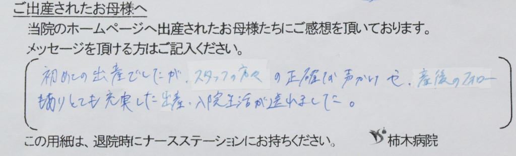 初めての出産でしたが、スタッフの方々の正確な声かけや、産後のフォローもありとても充実した出産、入院生活でが送れました。