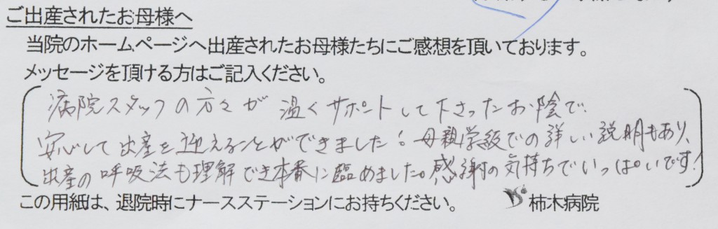 病院スタッフの方々が温かくサポートして下さったお陰で、安心して出産を迎えることができました!母親学級での詳しい説明もあり、出産の呼吸法も理解でき本番に臨めました。感謝の気持ちでいっぱいです!