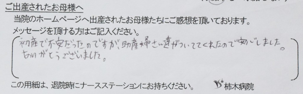 初産で不安だったのですが、助産婦さん達がついててくれたので安心しました。ありがとうございました。