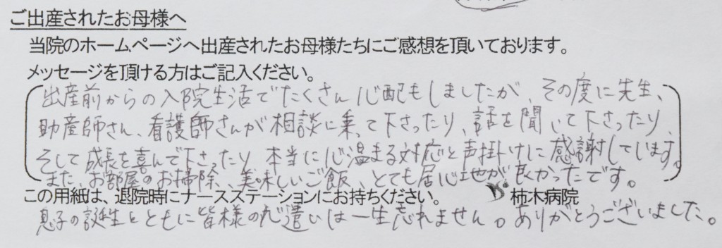 出産前からの入院生活でたくさん心配もしましたが、その度に先生、助産師さん、看護師さんが相談に乗って下さったり、話を聞いて下さったり、そして成長を喜んで下さったり、本当に心温まる対応と声掛けに感謝しています。また、お部屋のお掃除、美味しいご飯、とても居心地が良かったです。息子の誕生と共に皆様の心遣いは一生忘れません。ありがとうございました。