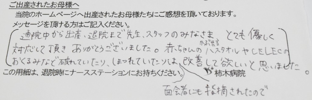 通院中から出産、退院まで先生、スタッフのみなさま、とても優しく対応して頂きありがとうございました。赤ちゃんのかぶせるバスタオルやCELECのおくるみなど破れていたり、ほつれていたりは、面会者にも指摘されたので改善して欲しいと思いました。