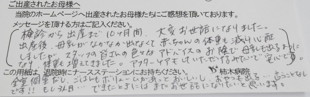 検診から出産まで10ヶ月間、大変お世話になりました。出産後、母乳がなかなか出なくて赤ちゃんの体重も減り心配しましたが、スタッフの皆さんの色々なアドバイスのお陰で母乳も出るようになり、体重も増えてきました。アフターケアもしていただけるみたいで安心です。全室個室だし、ごはんもボリュームがあっておいしいし、おやつも出る…言うことなしです!!もし3人目…できたときにはまたお世話になりたいと思います。