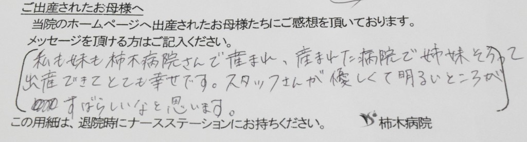私も妹も柿木病院さんで産まれ、産まれた病院で姉妹そろって出産できてとても幸せです。スタッフさんが優しくて明るいところがすばらしいなと思います。