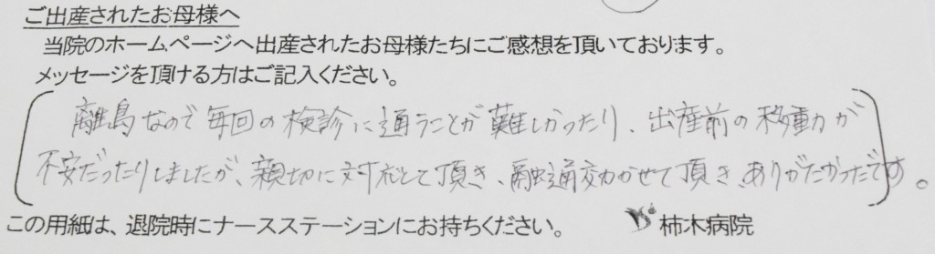 離島なので毎回の検診に通うことが難しかったり、出産前の移動が不安だったりしましたが、親切に対応して頂き、融通効かせて頂き、ありがたかったです。