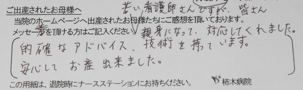 若い看護師さんですが、皆さん親身になって対応してくれました。的確なアドバイス、技術を持っています。安心してお産出来ました。