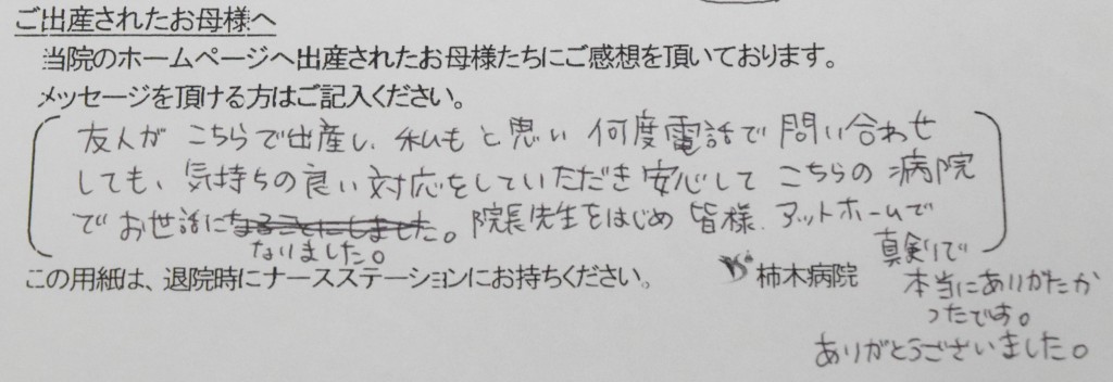 友人がこちらで出産し、私もと思い何度電話で問い合わせしても、気持ちの良い対応をしていただき安心してこちらの病院でお世話になりました。院長先生をはじめ皆様アットホームで真剣で本当にありがたかったです。ありがとうございました。