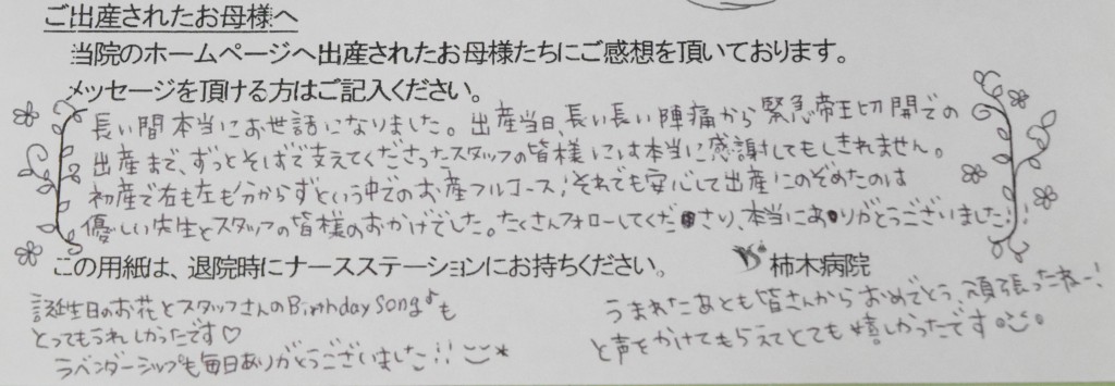 長い間本当にお世話になりました。出産当日、長い長い陣痛から緊急帝王切開での出産まで、ずっとそばで支えてくださったスタッフの皆様には本当に感謝してもしきれません。初産で右も左も分からずという中でのお産フルコース!それでも安心して出産にのぞめたのは優しい先生とスタッフの皆様のおかげでした。たくさんフォローしてくださり、本当にありがとうございました!!<br />