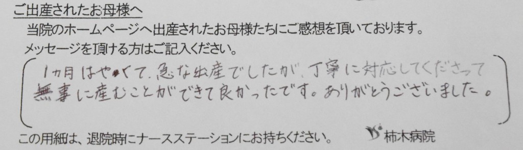 1ヵ月はやくて急な出産でしたが、丁寧に対応してくださって無事に産むことができて良かったです。ありがとうございました。