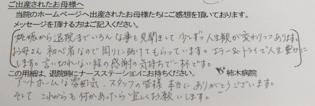 妊娠から退院までいろんな事を見聞きして少しずつ人生観が変わりつつあります。お母さん初心者なので周りに助けてもらっています。エラー&トライで人生豊かにします。言い切れない程の感謝の気持ちで一杯です。<br />