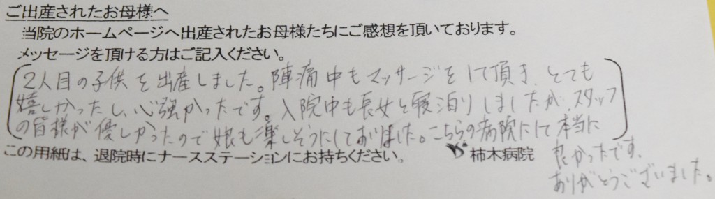2人目緒子供を出産しました。陣痛中もマッサージをして頂き、とても嬉しかったし心強かったです。入院中も長女と寝泊りしましたが、スタッフの皆様が優しかったので娘も楽しそうにしておりました。こちらの病院にして本当に良かったです。ありがとうございました。