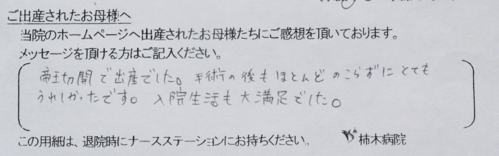 帝王切開で出産でした。手術の跡もほとんどのこらずにとてもうれしかったです。入院生活も大満足でした。