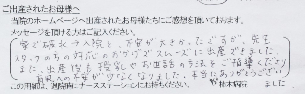 家で破水→入院と不安が大きかったですが、先生スタッフの方の対応のおかげでスムーズに出産できました。また、出産後も授乳やお世話の方法をご指導くださり育児への不安が少なくなりました。本当にありがとうございました。