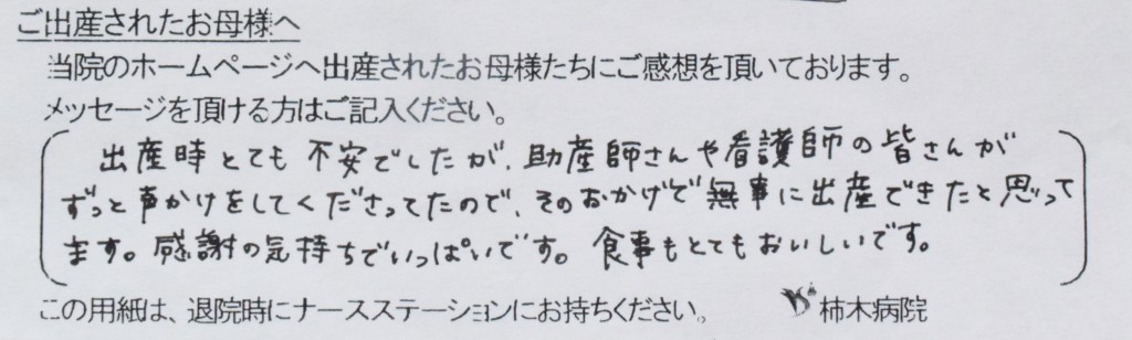 出産時とても不安でしたが、助産師さんや看護師の皆さんがずっと声かけをしてくださってたので、そのおかげで無事に出産できたと思ってます。感謝の気持ちでいっぱいです。食事もとてもおいしいです。