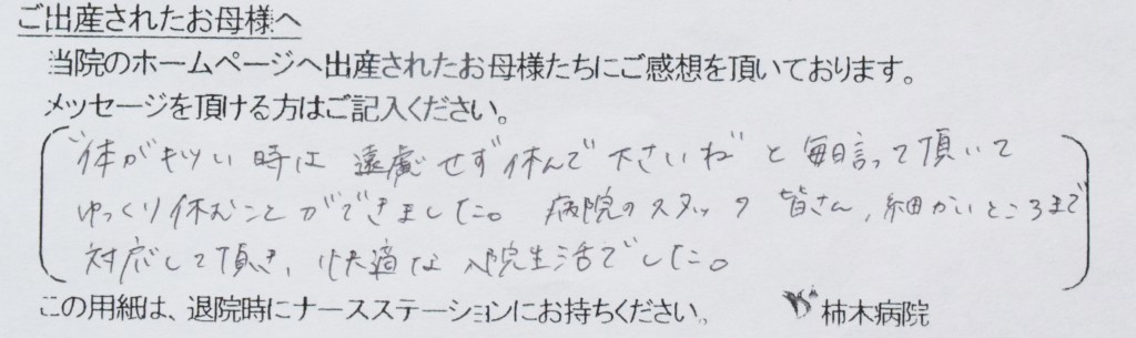 ”体がキツい時は遠慮せず休んで下さいね”と毎日言って頂いてゆっくり休むことができました。病院のスタッフの皆さん、細かいところまで対応して頂き、快適な入院生活でした。