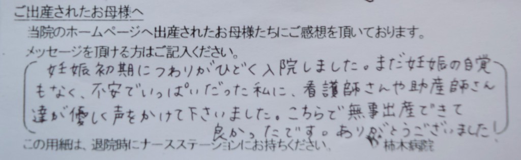 妊娠初期につわりがひどく入院しました。まだ妊娠の自覚もなく、不安でいっぱいだった私に、看護師さんや助産師さん達が優しく声をかけて下さいました。こちらで無事出産できて良かったです。ありがとうございました!