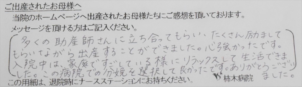 多くの助産師さんに立ち合ってもらい、たくさん励ましてもらいながら出産することができました。心強かったです。入院中は、家族ですごしている様にリラックスして生活できました。この病院での分娩を選択して良かったです。ありがとうございました。