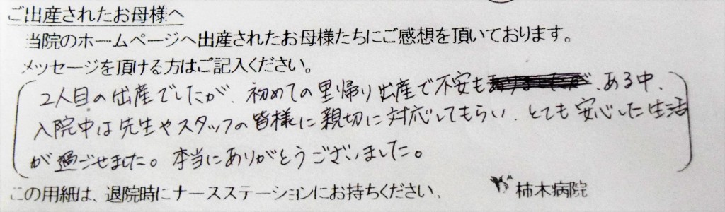 2人目の出産でしたが、初めての里帰り出産で不安もある中、入院中は先生やスタッフの皆様に親切に対応してもらい、とても安心した生活が過ごせました。本当にありがとうございました。